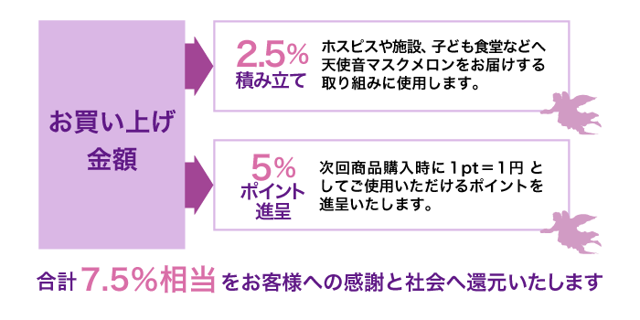 当サイトでご購入いただいた金額のうち、2.5%相当を積み立て、ホスピスや施設、 そして子ども食堂など、必要とされる場所へ天使音マスクメロンを定期的にお届けしています。